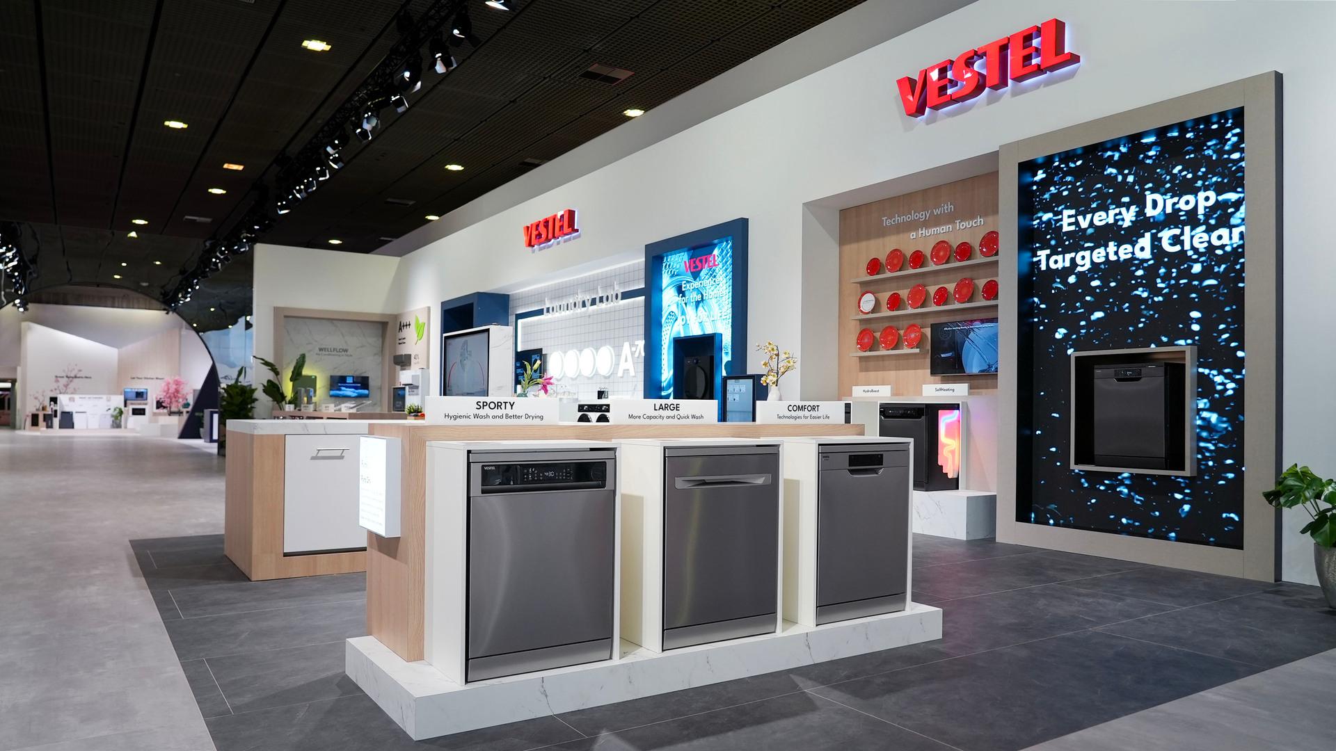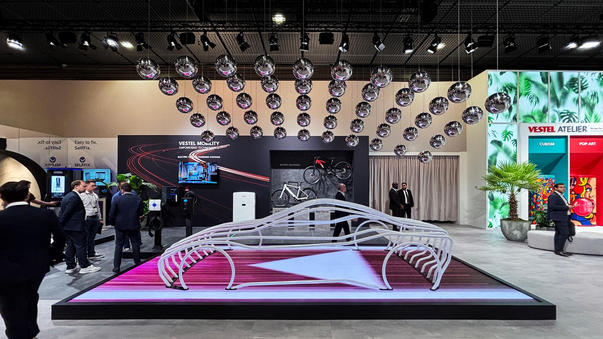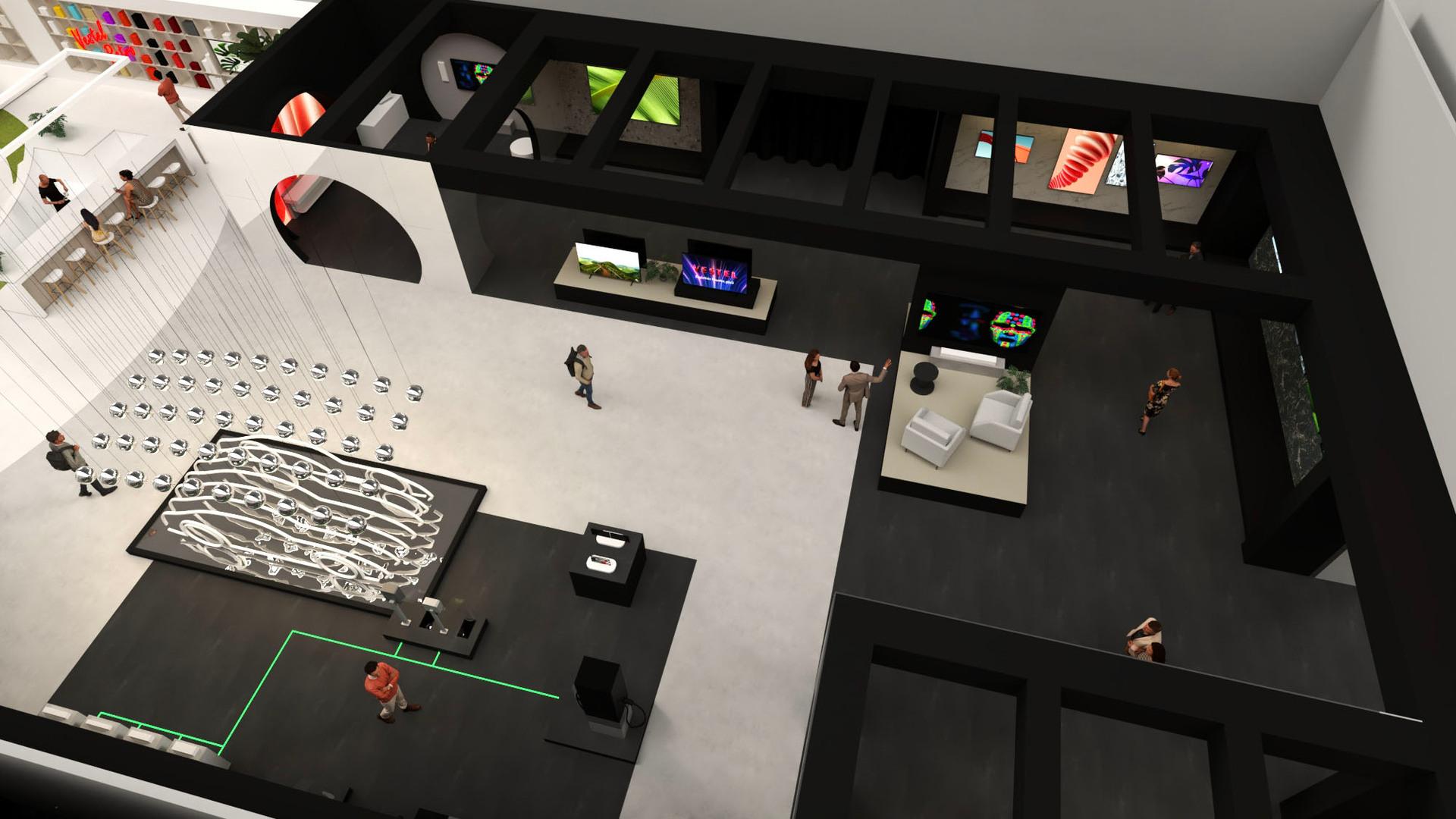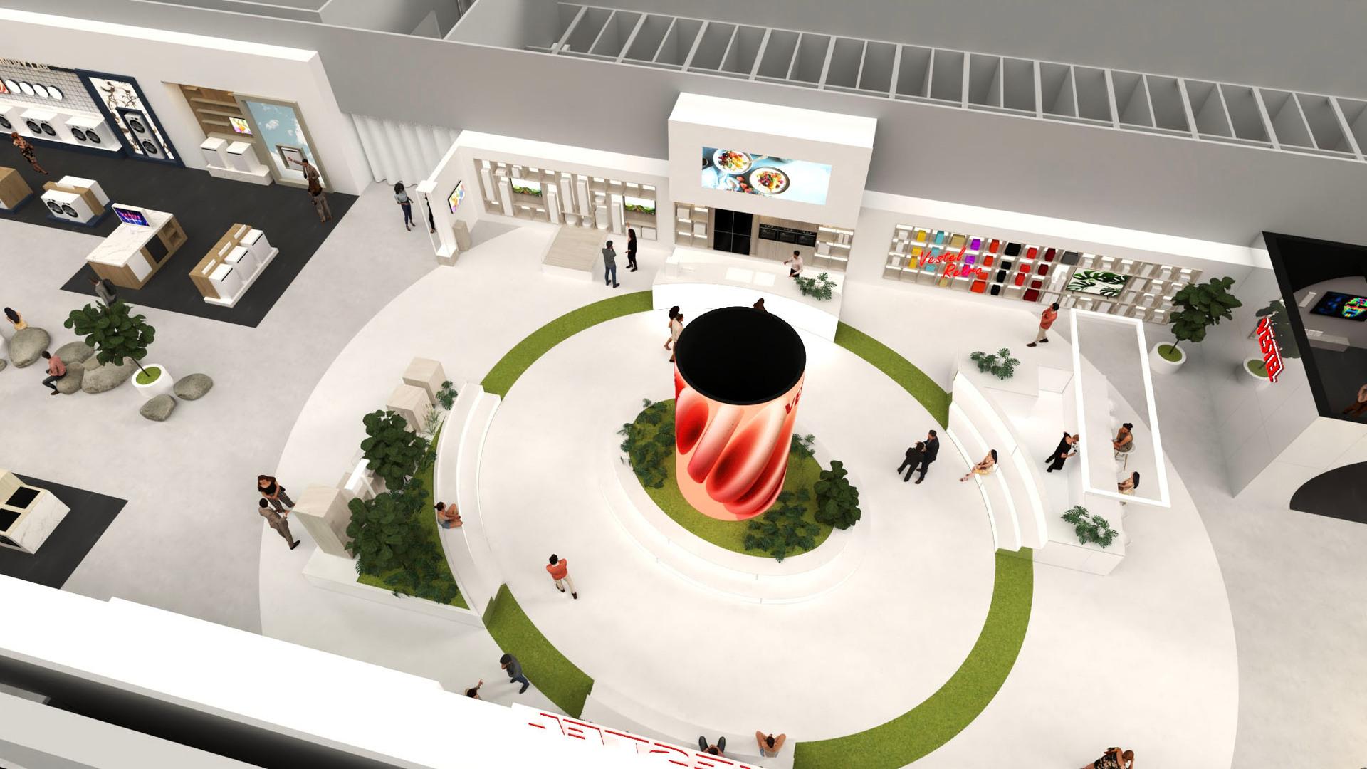 The layout is organized into several zones, each with its own theme or product group. At the heart of the stand everything comes together: a central meeting point where key products are displayed among standout elements such as the green wall and illuminated furniture. This open plaza invites visitors to gather, exchange ideas, and experience the products that aim to improve daily life and contribute positively to society.